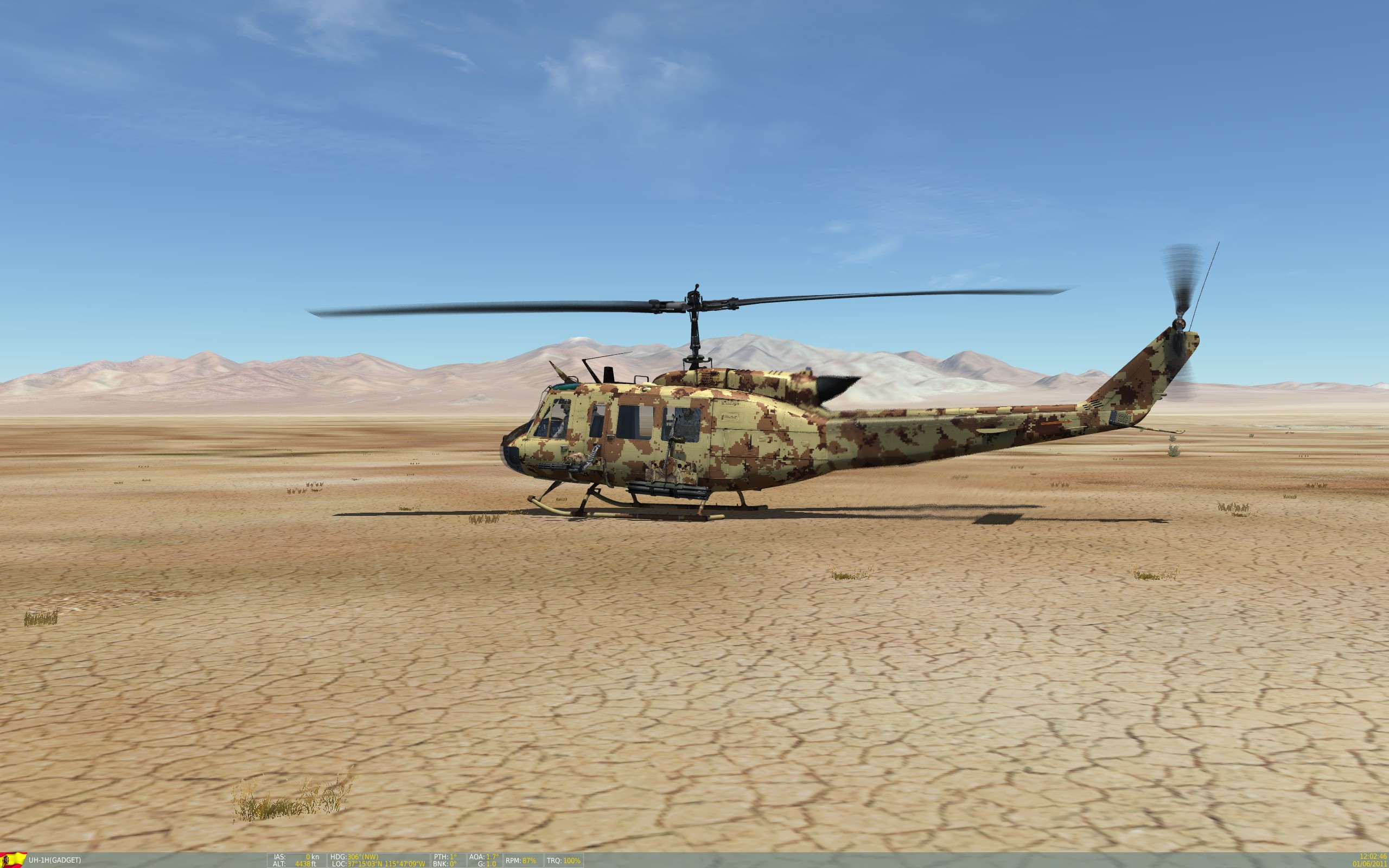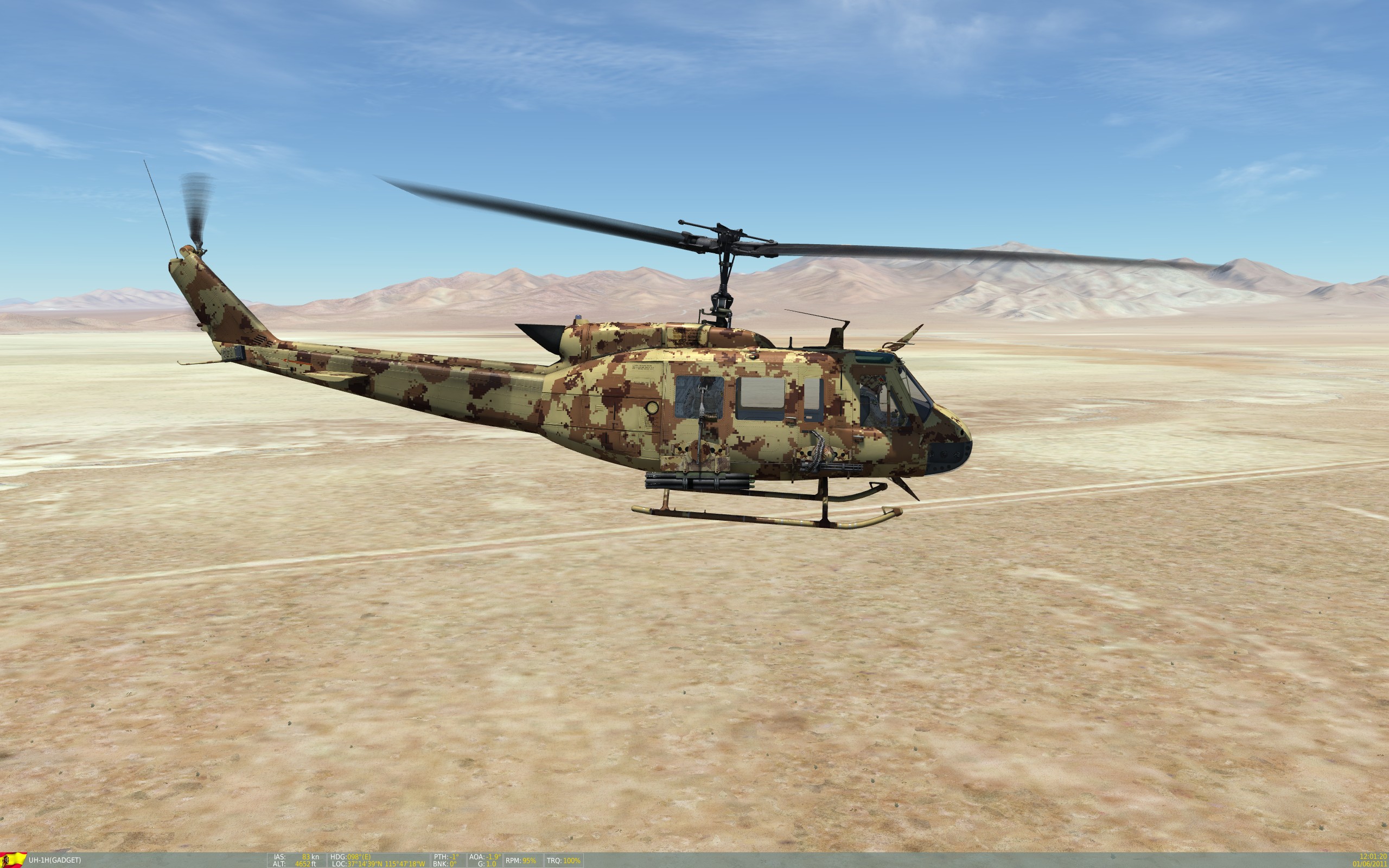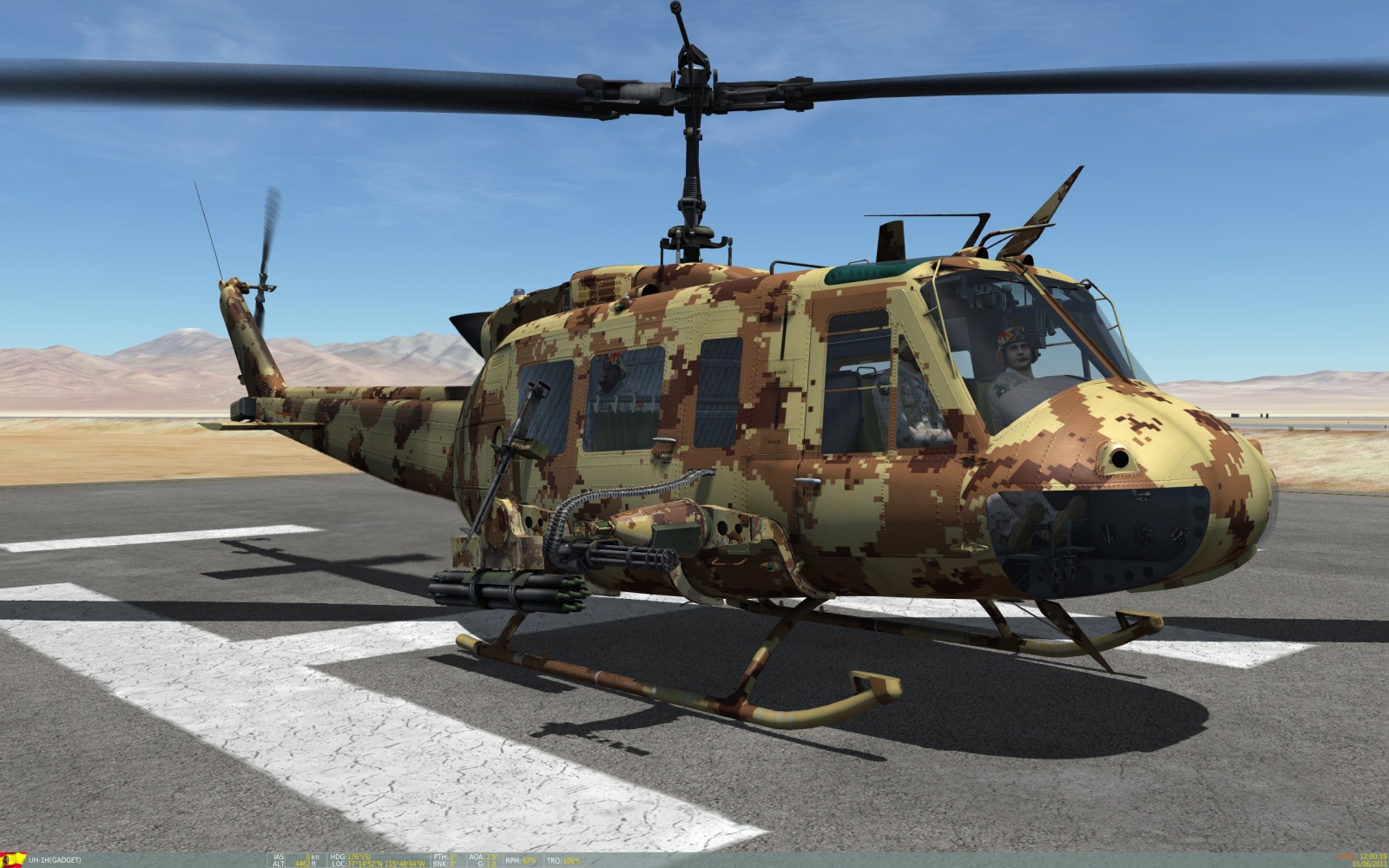 This a skin featuring a realistic CADPAT Arid Regions Camo (https://en.wikipedia.org/wiki/CADPAT), appied to a UH-1H helicopter for desert enviroment. specially useful on the Nevada map.