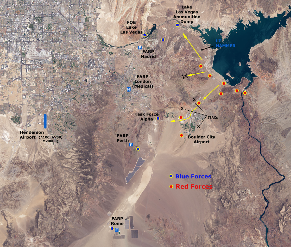 Reds have taken Boulder City and the Hoover Dam. A10CII & AV8B CAS missions for our armoured counterattack, SEAD mission for FA-18s, Troop insertion for Hueys, Chinooks and CAS for AH64s. Control ground forces through combined arms to complete the mission. C130Js airdrop to FOB