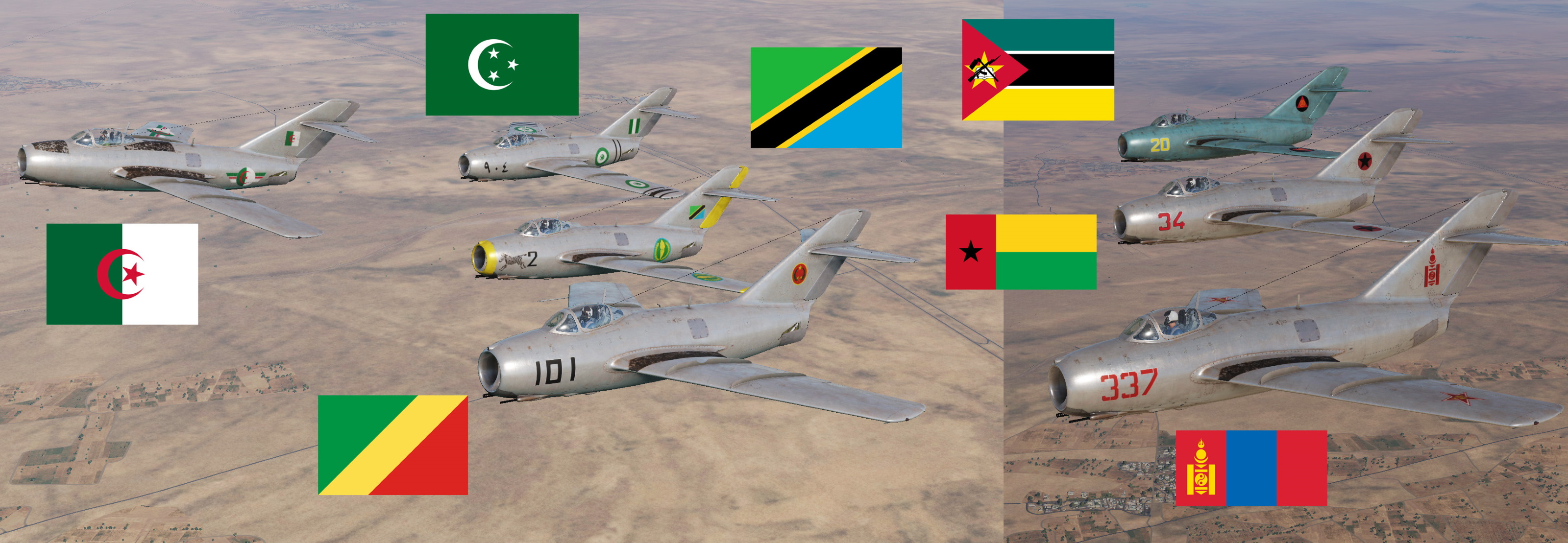 MiG-15bis based on MiG-15bis and MiG-15UTI of the Air Forces of Algeria, Congo-Brazzaville, Kingdom of Egypt, Guinea-Bissau, Mongolia, Mozambique and Tanzania with dynamic BORT numbers.