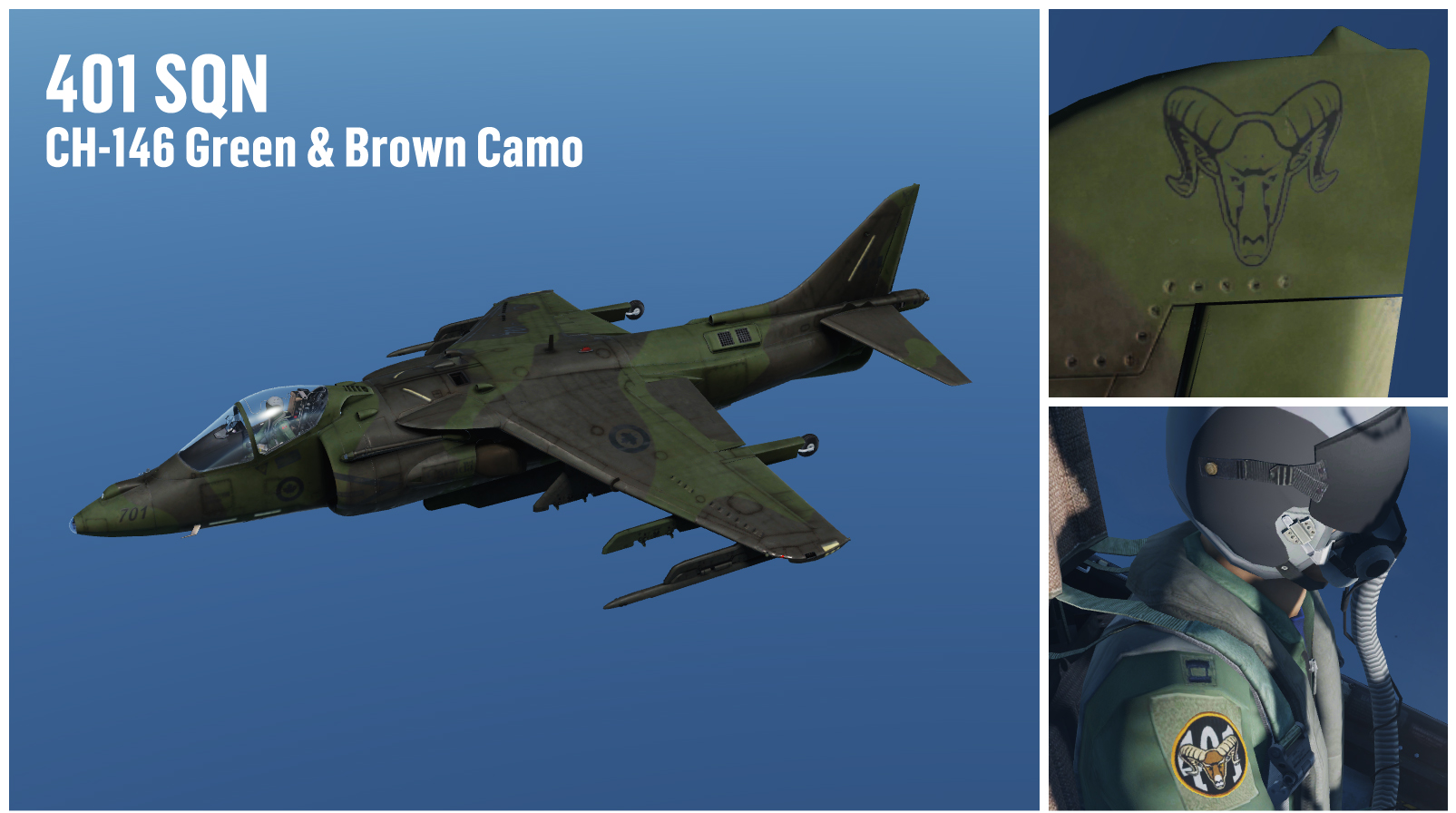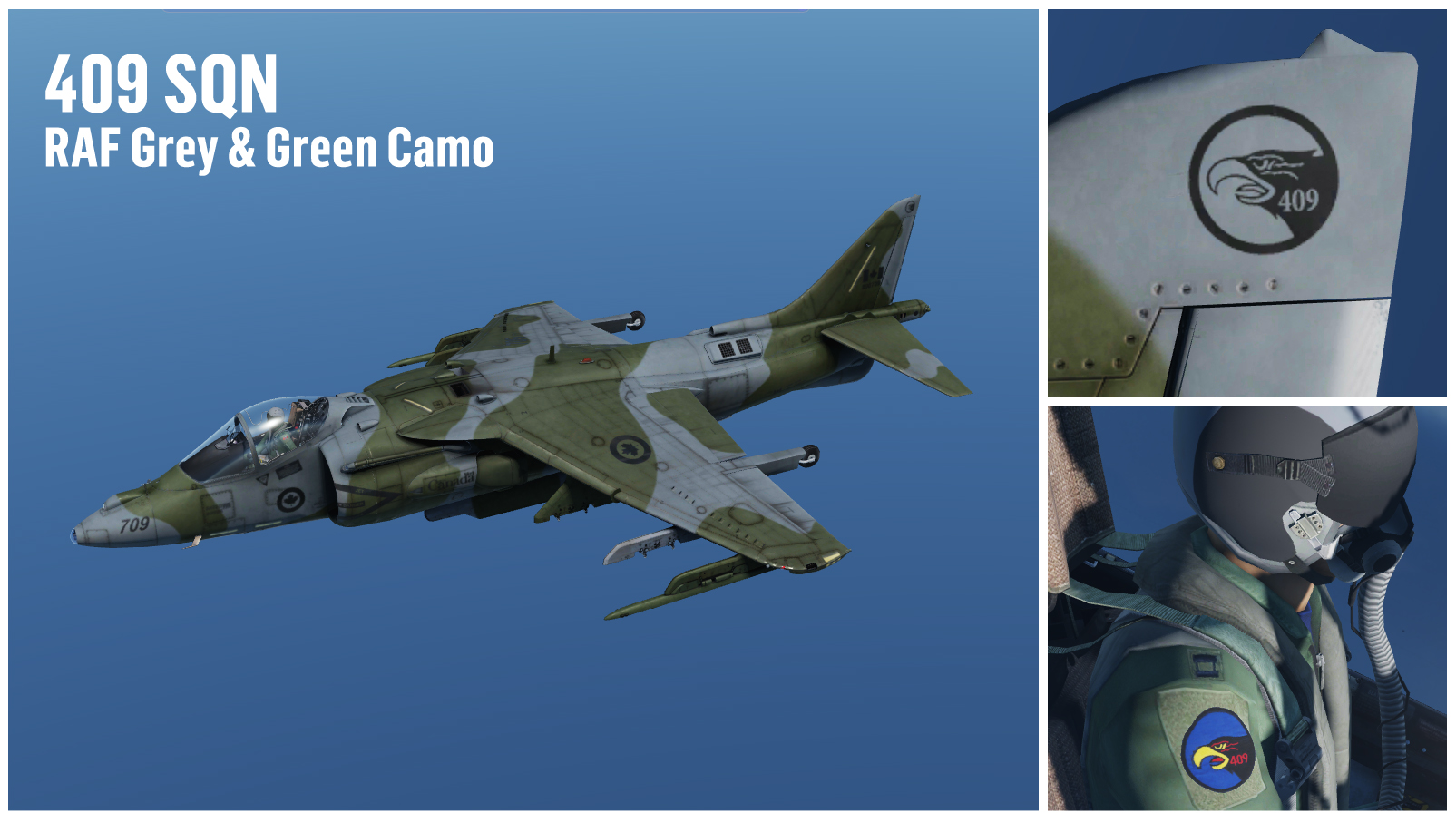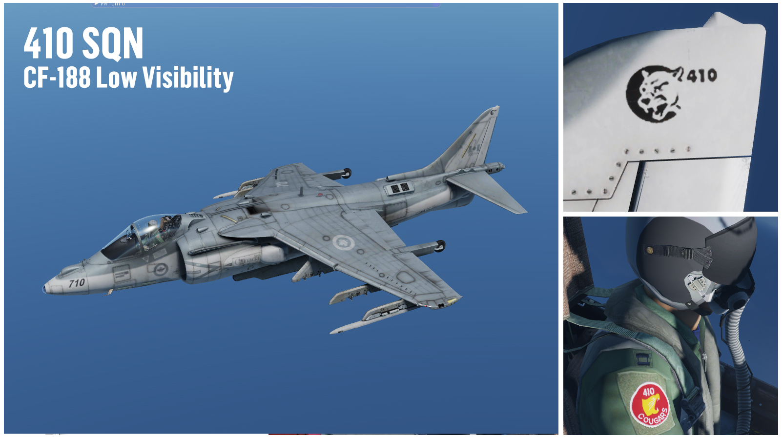 This the first part of a 3 sections/parts package, total of 9 different liveries for the Harrier, 7 different camo colors, 2 low-visibility. Camo pattern is based on USN Early 90's AV-8B. Each color is based on real found image of ACtive or retired aircrafts, mostly RAF, RCAF, USN, USAF. This 3 part package will replace my v2 (AV-8B N/A - Fictional RCAF Low Visibility+Weathered 425 TFS/ETAC Livery Pack (v2)) Which onces these 3 parts are online, the other willl be deleted. All liveries are medium weathered, so no more weathered and almost clean versions. Each livery wears one of the RCAF Squadrons that fly or flew the CF-188 (yah, can't wait the Hornet module to come out).