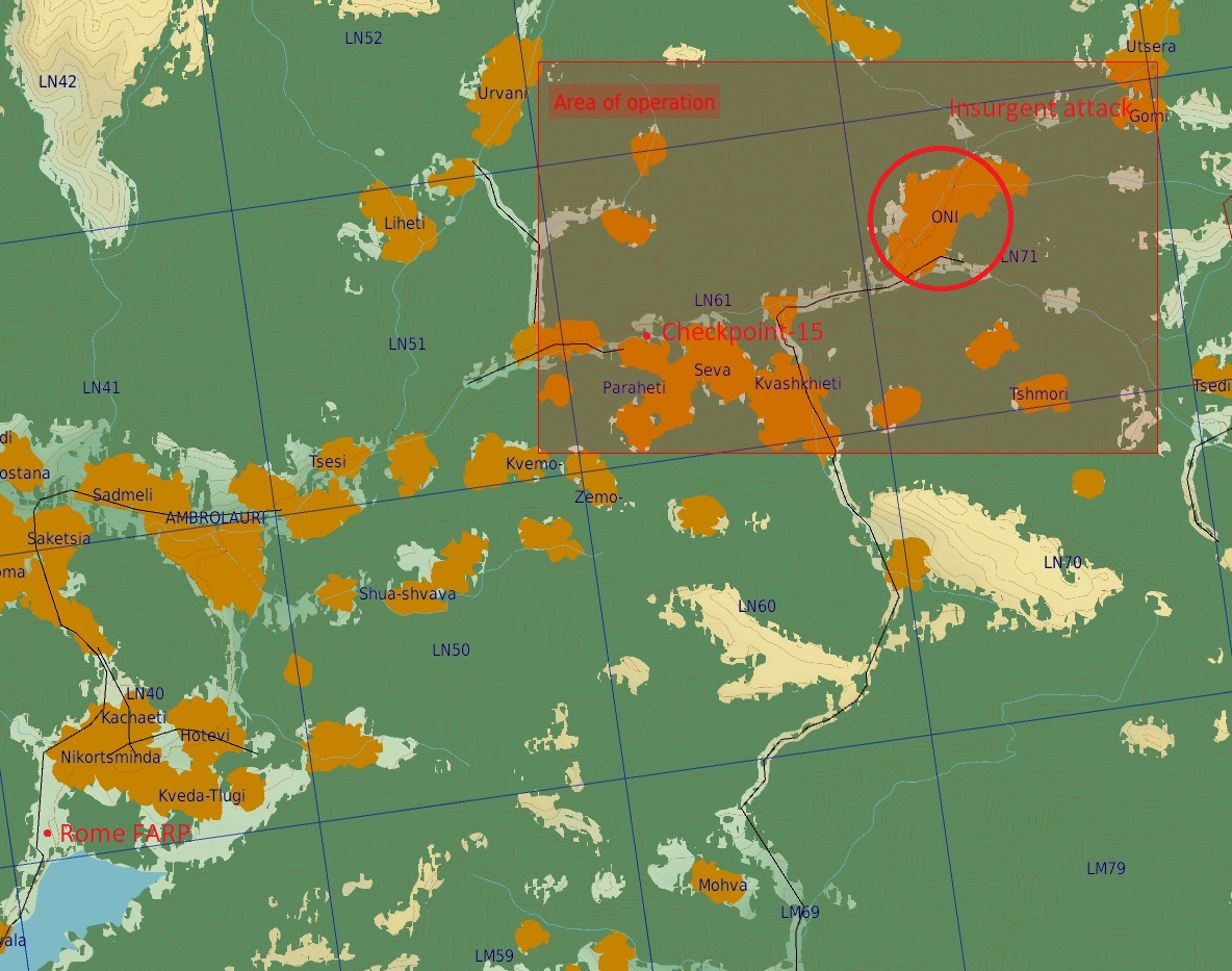 Part of 2nd Motorised division, stationed in Oni town came under attack by large unknown insurgent force. After a short firefight survivors retreated fr om the town on a group of APCs and trucks. The town was indiscriminately hit by two Su-25 bombers to ensure safe egress. Reports of insurgent infiltration are coming all over the place to the north of Ambrolauri, including Checkpoint-15, wh ere contrigent of 2nd MD is also stationed.