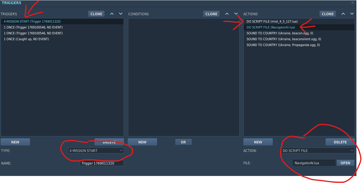 2) In the mission editor add triggers ON MISSION START (This is important: load MIST first, then NavigatorAI next ON MISSION START.